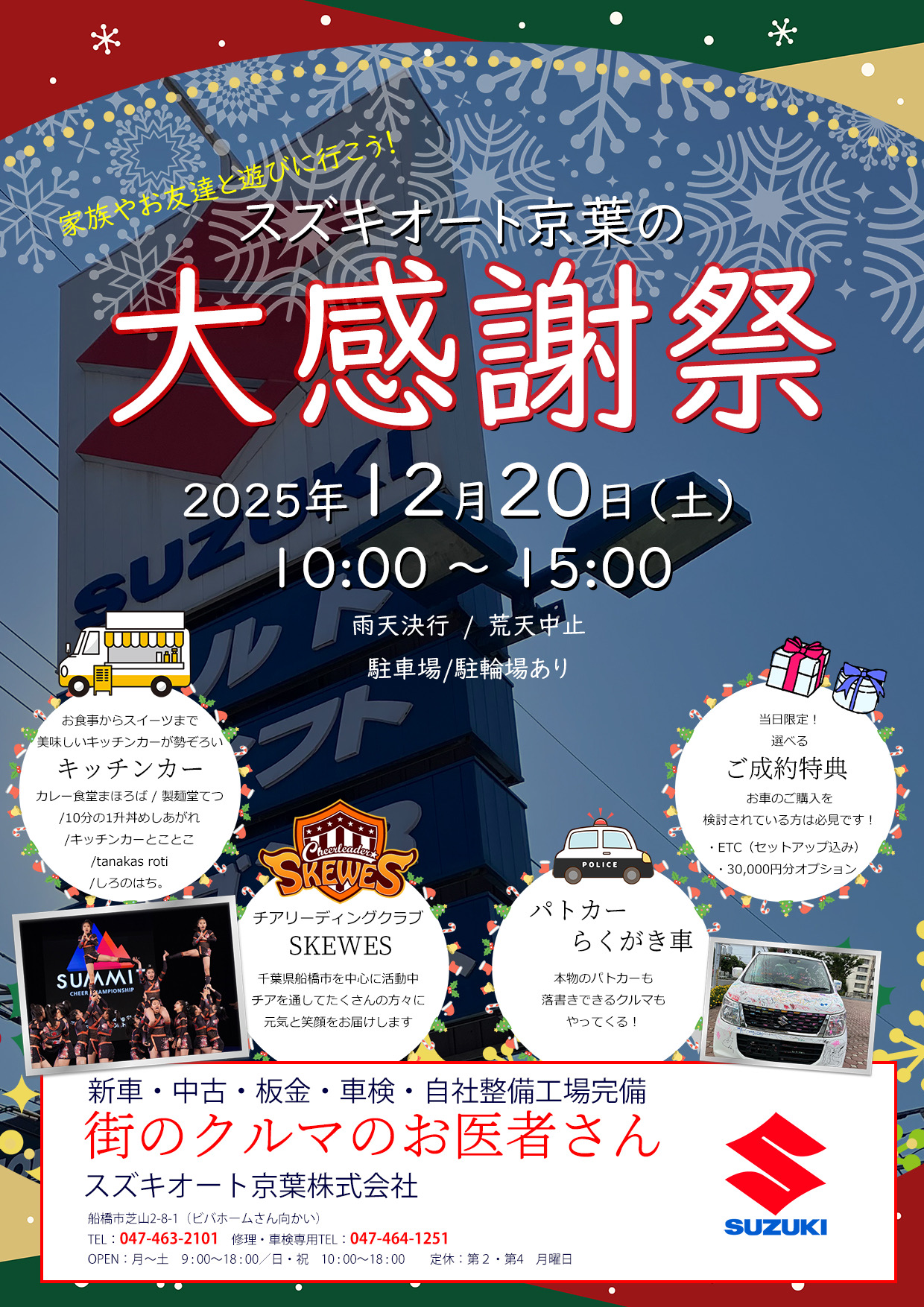 スズキオート京葉 大感謝祭 予告‼️ 投稿日 2025年11月12日 更新日 2025年11月13日 著者 suzukiautokeiyo カテゴリー イベント 早いもので今年もカレンダーが残り1枚になってしまいました。 皆様方に日頃の感謝を込めてイベント開催を予定しております(^-^) 本日は開催予告のご案内までですが、詳しい情報は追ってご案内致します! この記事を書いた人 suzukiautokeiyo 記事一覧 ウェブサイト