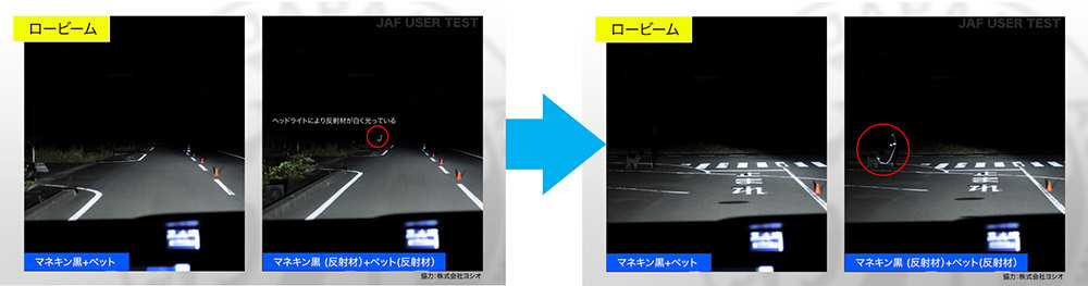 図のようにハイビームとロービームでは発見までの距離が圧倒的に違いが出ます。