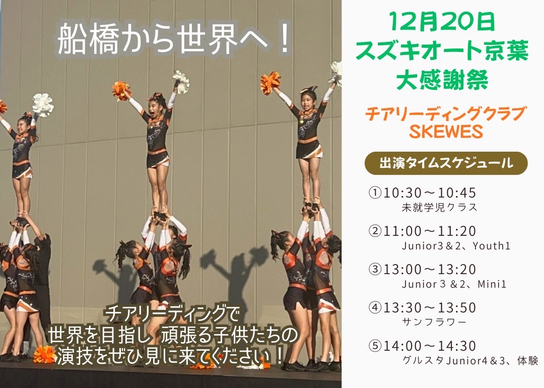 世界を目指しているチアリーディングのパフォーマンス、キッチンカーの出店、コリント・輪投げ・スーパーボール救い等の縁日コーナー、特別商談会などで皆様をお待ちしております!