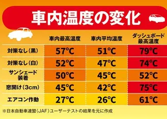 上の写真は車の色によっても車内温度に差が出るとのテストです。(JAFより引用)